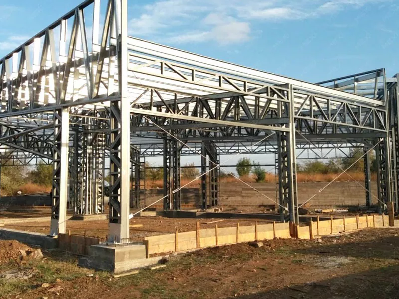 2. Grondslagvoorbereiding Geologiese opnames word gedoen om die grondtoestande te evalueer en die toepaslike fondasietipe, soos betonblaaie of pale, te bepaal. Die fondasie word volgens ontwerpspesifikasies voorberei om die gewig en vragte van die staalstruktuur te ondersteun.