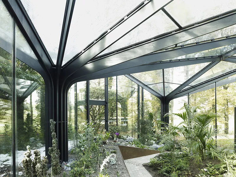 Staalraamwerk: Die hoofstruktuurstelsel van die botaniese saal bestaan uit staalbalke, kolomme en kappe, wat die nodige sterkte en stabiliteit verskaf om die dak, mure en ander argitektoniese elemente te ondersteun.
