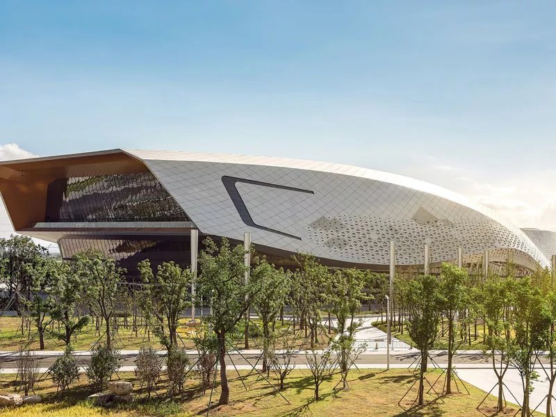 Groot span: Die voorafvervaardigde staalstruktuur-sportsentrumkompleks behaal multifunksionele buigsame ruimtes deur 'n groot-span-kolomvrye ontwerp.